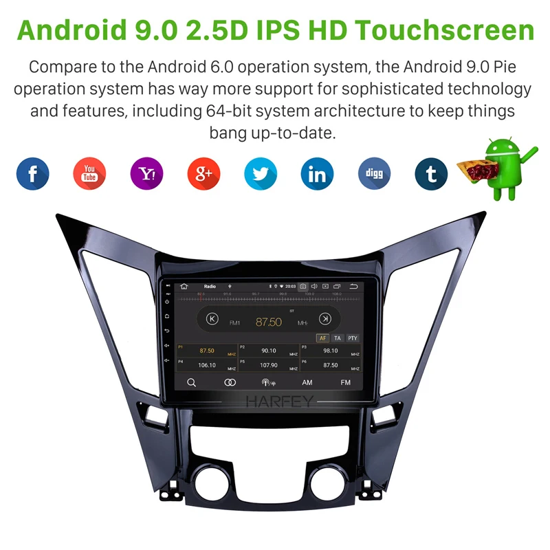 Harfey 9 inch Android 9.0 Car GPS Radio Multimedia Player For 2011 2012 2013 2014 2015 HYUNDAI Sonata i40 i45 Head UnitDear customer, You can choose the android 9.0 , 8-core, RAM 4GB + ROM 32GB system or android 9.0, 4-core, RAM 2GB + ROM 16GB systemOS: android 9.0 operation system. CPU: High quality 8 - Core 1.5 GHz Coretex-A53 processor / 4-Core 1.5 GHz Coretex-A35 Hard Disk: 32 GB / 16GB INand Flash RAM: 4GB / 2GB LDDR3 Screen: HD 1024*600 multi-touch screen with smooth operation,high sensitivity and abundant interactionfor the better view of your road ahead. UI: With exquisite and user-friendly user interface, you can set any of your favorite application icons as shortcut on the main menu and set the position of the icons according to your preference 3G/4G&WiFi/App download/3D Navigation/Radio Tuner/Bluetooth/Dual Zone/ File Management/HD 1080P Video/Steering Wheel Control/Mirror Link/OBD2/DVR/Backup camera/MP3/AUX/USB/SD etc. FeaturesHigh Speed 3G/4G&WiFi Internet:The system supports surfing internet via 3G or WiFi. It comes with WiFi module. You can perform Google search on the road with quick search box, play online games, watch videos, download online data and check emails by connecting to any WiFi hotspot in range or 3g internet. App download:It replaces your factory radio with android based system of great utility and extendibility. You can download any applications in the android market for access to games, Skype, MSN, YouTube, twitter, E-Book, Gmail etc. This system also supports installation or removal of apps on RAM or SD optionally. 3D Navigation:The car stereo is equipped with worldwide real-time navigation function of high accuracy. With current location, speed, mileage, landmark building display, 3D street view, destination search and turn-by-turn voice directions, it will be your perfect road companion. With dual zone function, the music from radio/AV/DVD/TV etc can be played behind the scene under GPS mode and it will switch to the GPS voice automatically. Radio Tuner:Built-in with strong digital FM/AM radio tuner, this car A/V system features searching radio channels automatically, manually and storing them in the process. RDS is also supported. Bluetooth:It upgrades your car with BC6 Bluetooth module for hands-free calls and music streaming. With ringtones and voice coming out from the car speakers, you can dial, answer, reject and mute calls without taking your hands off the steering wheel. Its phonebook function enables you to search for contacts directly on the big screen of the head unit. The capability to stream your favorite tunes from the Smartphone wirelessly is also desirable. An internal microphone is included for distortion-free talking. Office Tools:You can read and edit office files such as WORD/EXCEL/POWERPOINT/PDF/TXT on it as your tablet. File Management:With file browser, you can open files with the corresponding applications, search files and manage them. HD 1080P video:HD 1080P video playback is supported by this car DVD player. AUX:This function is for audio, video input and output from external devices. Steering wheel control:Your original car’s steering wheel controls will still work after installation. 32GB USB/SD Connection:with USB and SD slots of 32GB capacity, this unit allows for audio and video play, photo view, E-book Reading etc from SD or USB. MP3、WMA、AAC、RM、LFAC audio formarts,MPEG-1/2/4、H264、H263、VC1、RV、RMVB、DivX、Sorenson SparK、Spark、VP8、AVS Stream video and JPG/BMP/JEPG/GIF/PNG picture are supported. IPod/IPhone Charging:This multimedia supports charging your iPod/iPhone via the USB cable. OSD Languages:37 kinds of OSD languages are supported including: Chinese Traditional, Chinese Simplified, Japanese ,Korean ,Arabic ,English (Australia),English (Canada) ,English (new Zealand),English (Singapore),English (United kingdom),English (United States) ,Afrikaans, Bahasa Indonesia ,Bahase Melayu ,Deutsch(Deutschland), Deutsch(Liechtenstein), Deutsch(schweiz), Filipino, Fancais(Belgique), Fancais(Canada), Fancais(France),Fancais(Suisse),Italiano(Italia), Italiano(Svizzera), Kiswahili, Latviesu, Magyar,Nederlands, Norsk bokmal,Polski, Portugues(Brasil), Portugues(portugal), Rumantsch, SlovenCina,Suomi, Svenska ,Pyccknn. Designable Elements:8 live wallpapers and 21 wallpapers are preset. You can set any picture you like as wallpaper. You are also enabled to DIY startup picture and main menu. Built-in Amplifier:4 channel output 4*45W Amplifier is embedded into this car audio system. Mirror link:It synchronizes your mobile phone trough WiFi or USB. This technology enables you to gain access to your Smartphone’s applications on the unit to play music and videos etc. It currently supports iPhone, Samsung Galaxy (android 4.2 and above). OptionsDVD player:With this one din DVD player, you can play CD and DVD discs. With anti-shock and last position memory technology applied, you can watch movie or video in motion. Formats such as DVD/DIVX/MP4/MP3/MP2/VCD are compatible. HD Digital TV:DVB-T/ATSC/ISDB-T HD TV Tuner can be provided for receiving digital TV channels. Car DVR:The DVR function is used for recording the whole process of traffic accidents, taking photos for front of vehicles and storing the video in real-time while driving. 3G/4G module:With this 3g/4g module, you can connect to 3g/4g internet by inserting an SIM card to it. Backup Camera:It adds a backup camera for automatically switching to the parking image while reversing. This option includes a waterproof and night vision backup camera which will be mounted to the position of your car’s license plate lights and the cables for its connection. The default rearview camera is wired. If you need the wireless one, please send a note us after placing order. OBDII:With this OBDII Scanner, you can connect it to your car’s DLC port and open the unit’s Bluetooth for monitoring the car’s fuel consumption, water temperature, revolving speed, environment tem