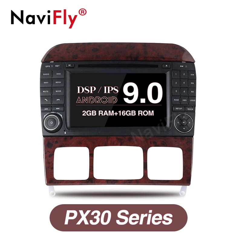Navifly DSP Car Multimedia Video Player Navigation GPS Android 9.0 For Mercedes Benz W220 W215 S280 S320 S350 S400 S Class with 4G wifi bluetooth DSP IPS screen ! Please Note ! This model includingIPS ScreenandDSP Function Main Features System Android 9.0 CPU rock chip px30 quad core RAM 2GB DDR3 ROM 16GB Platform PX30 SERIESCortex-A35 Quad core1.5G RK3326 Framework Cortex-A35 64 Bit Resolution HD 1024*600 Capacitive Touch Screen DSP+IPS Including IPS screen and DSP function. Support DVR OBD2 DAB+ rear view camera Mirror screen for android &iphone Wifi Built-in WiFi Adapter UI its UI will automatically switch between day and night. Radio tuner IC ST 7786 CANBUS ---> this model include CANBUS already! support steering wheel control,AC climate,door open alert,parktronic,trip,oil gauge etc,SupportOriginal car information display For Mercedes-Benz W220 S280 S320 S350 S400 S430 S500 1998-2005