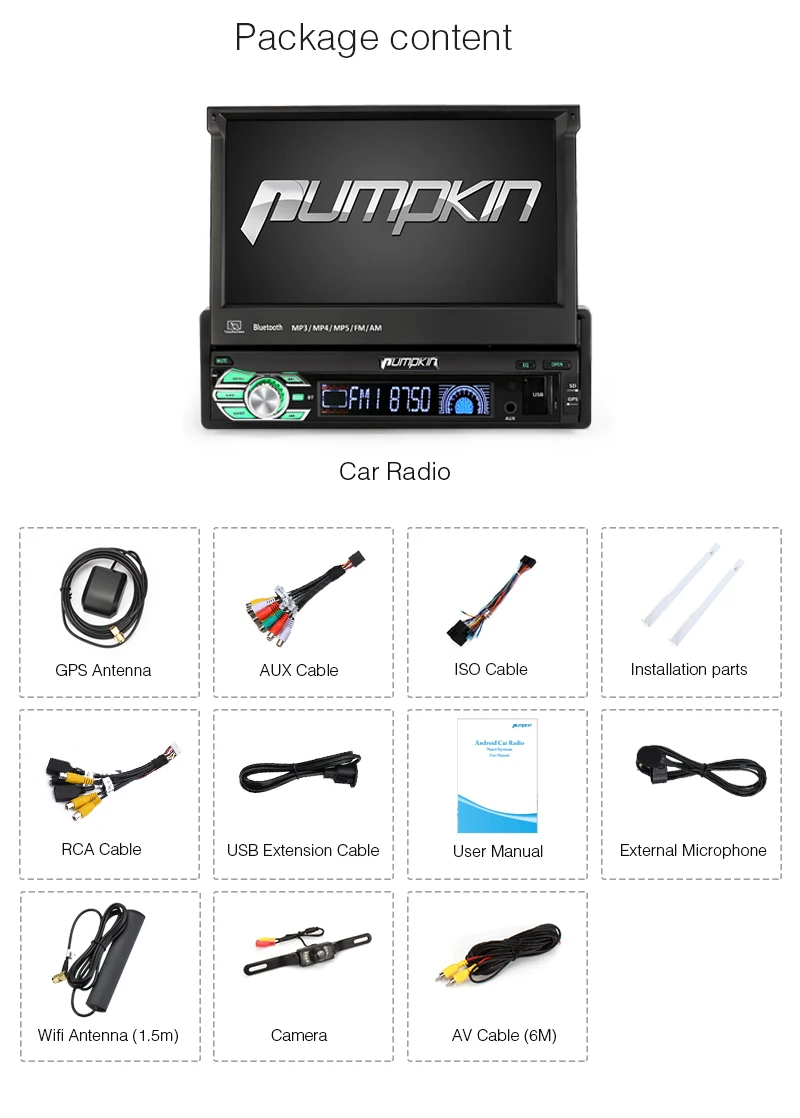 Pumpkin 1 Din 7'' Android 8.1 Car Radio No DVD Player GPS Navigation Octa Core Car Stereo 2GB RAM FM Rds Wifi 3G DAB+Headunit Video of link on Youtube: https://youtu.be/pNnZpVbMRYY